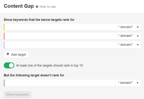 W analizie Content Gap możesz porównać się do kilku konkurentów jednocześnie. Wpisz ich domeny lub blogi na górze, a swoją stronę – na dole.