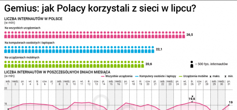 Najmniej użytkowników w tygodniu roboczym odnotowano w środę 26 lipca - było to 19,5 mln osób. Natomiast najmniej aktywnym weekendowym dniem wakacji była sobota 29 lipca – 17,3 mln internatów.